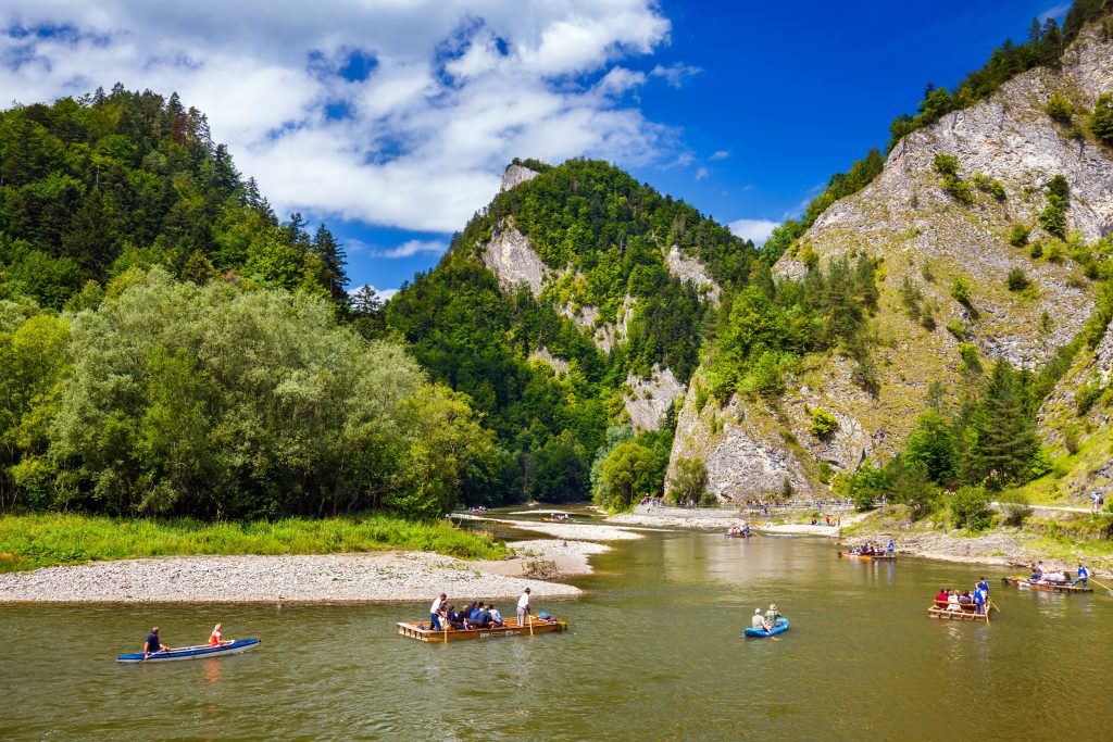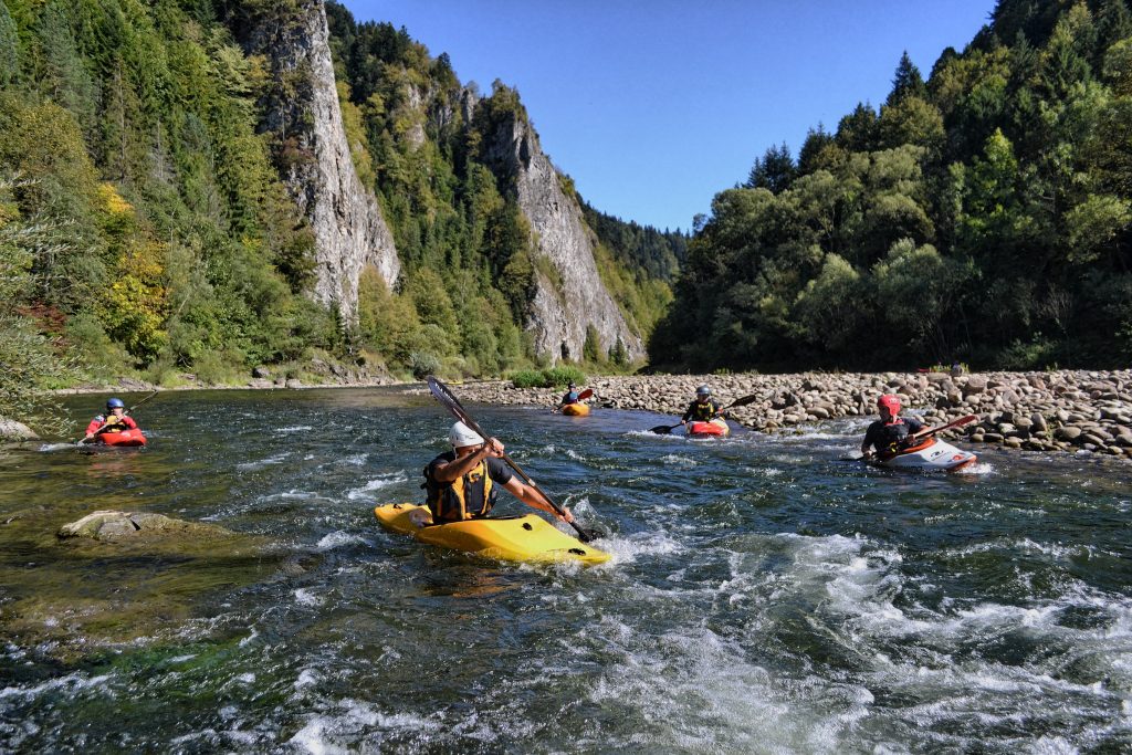 A potem jest Dunajec, który w kajakowym świecie Małopolski gra rolę niemal legendarną. I słusznie. Z jednej strony mamy spokojne, rodzinne odcinki – jak Jurków – Zakliczyn, idealny na 2–3 godziny leniwego płynięcia wśród wzgórz i kamienistych brzegów. Z drugiej – przełom Dunajca, czyli klasykę, którą zna każdy, kto choć raz widział zdjęcia z Pienin. Odcinek Sromowce Niżne – Szczawnica jest niezwykle widowiskowy, ale przy sprzyjających warunkach pozostaje dostępny także dla początkujących – nurt jest wartki, lecz przewidywalny, a trudność zwykle nie przekracza poziomu rekreacyjnego. Dla bardziej doświadczonych wciąż pozostaje wyzwaniem w kontekście techniki i pracy z nurtem, zwłaszcza gdy nad głową wyrastają ściany Trzech Koron i Sokolicy. To dobry pomysł na wakacyjny projekt – kilka dni, różne odcinki, różne tempo.
